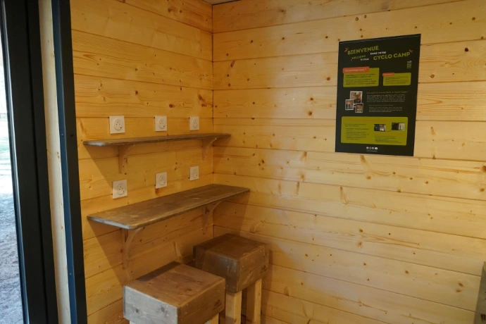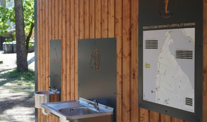 L’aménagement regroupe plusieurs services simples mais essentiels pour les cyclistes, permettant de créer un véritable point d’accueil sur le territoire.